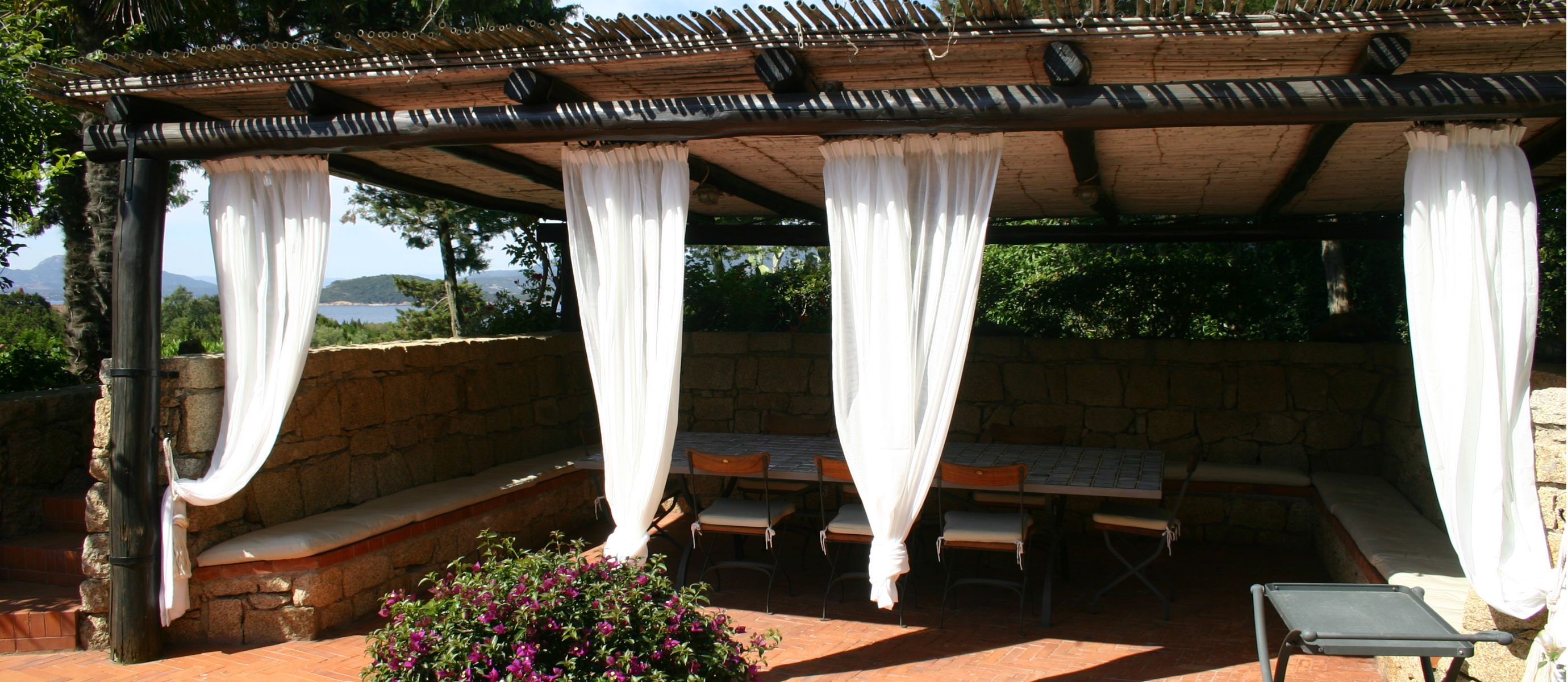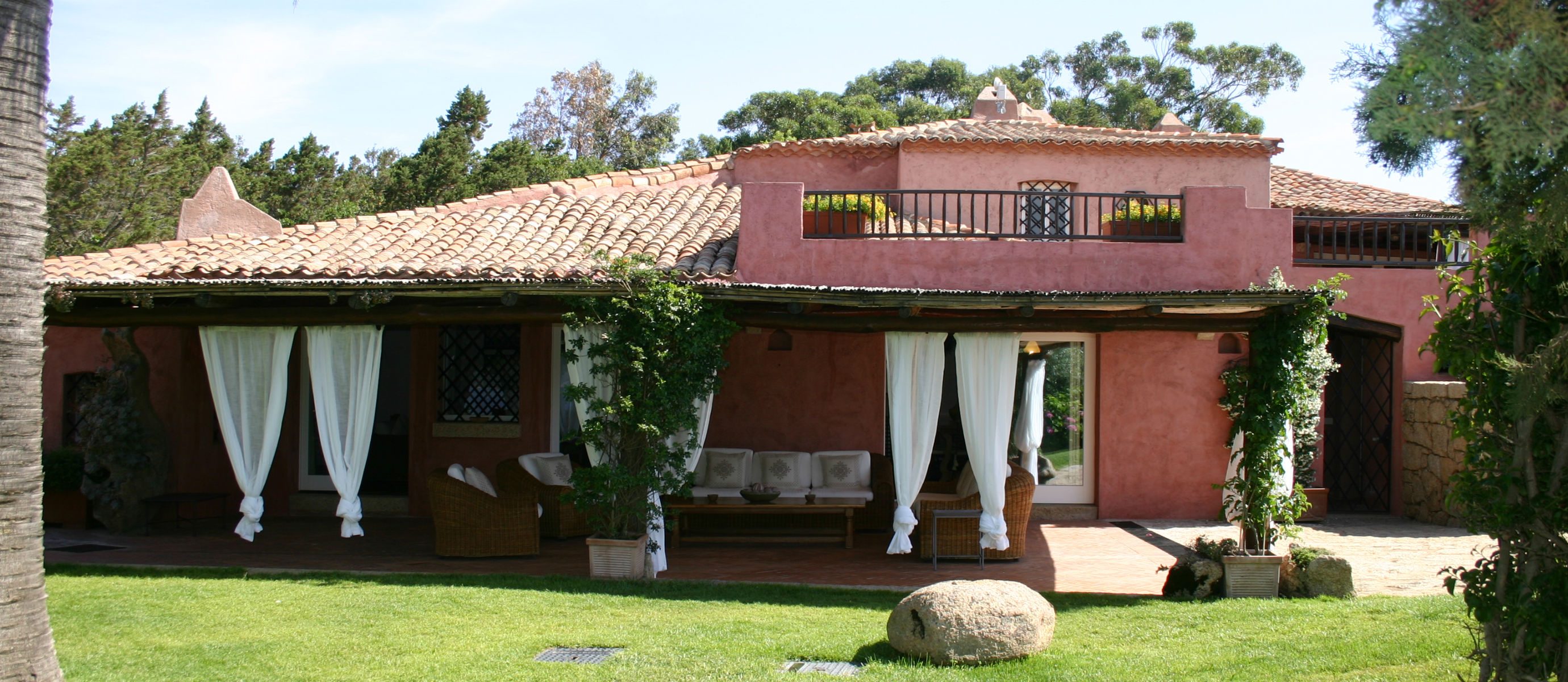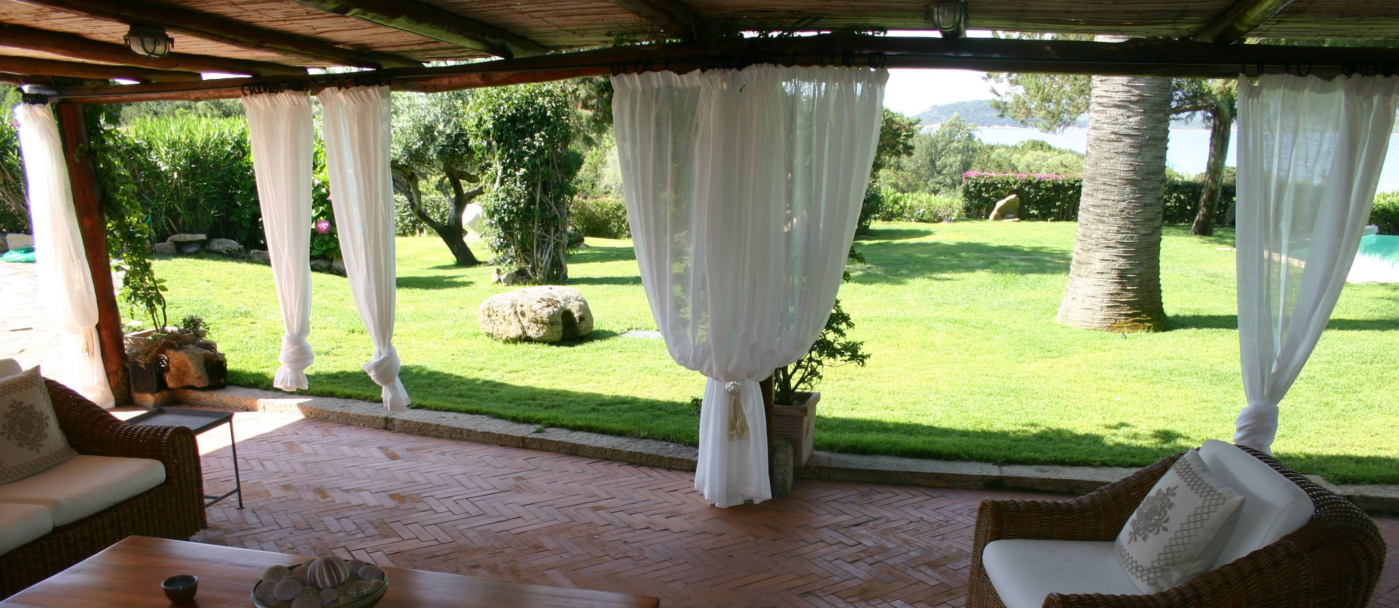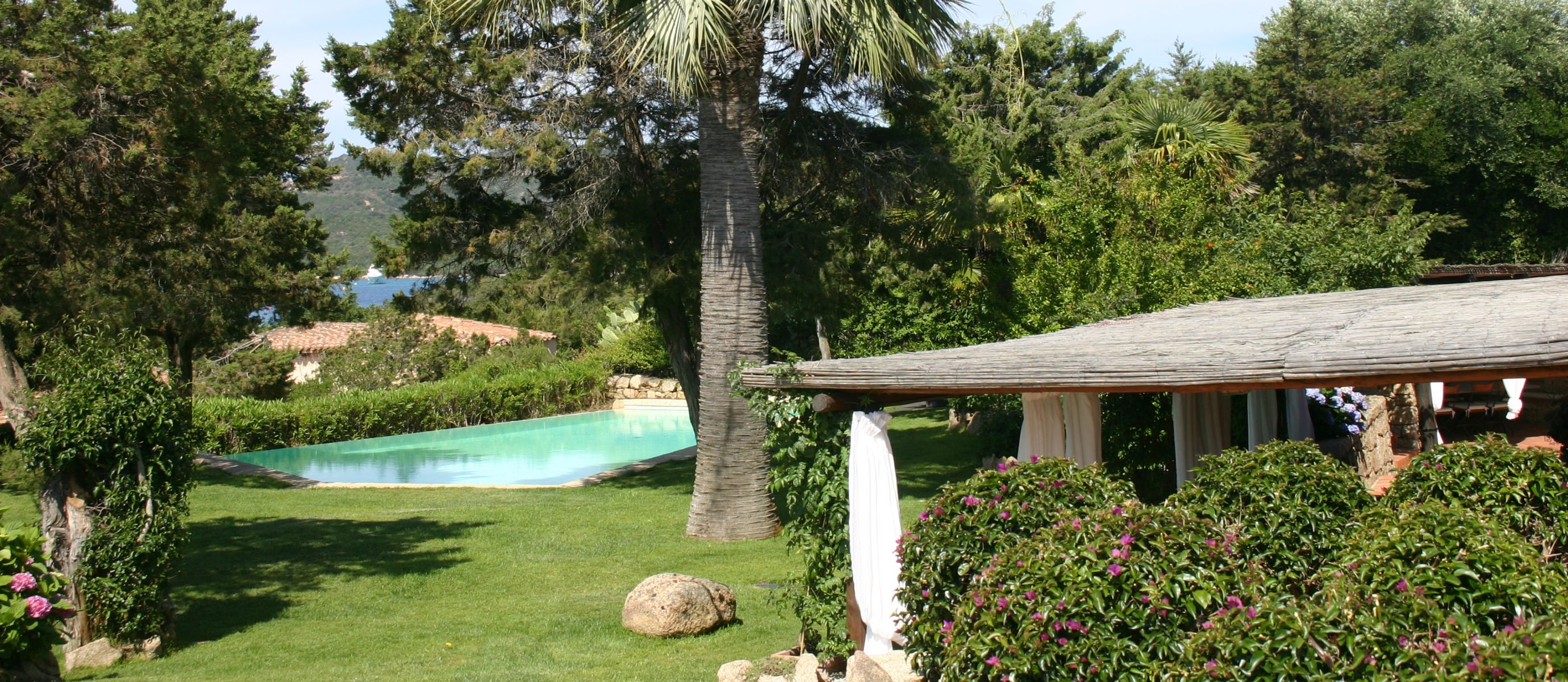 There is a large covered terrace overlooking the bay of Capriccioli, and a lovely BBQ area with covered dining terrace to the side of the house. There is a lush Mediteranean garden full of palms,oleander and bougainvillea, and a swimming pool, in a position overlooking the sea.