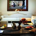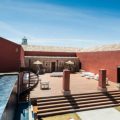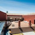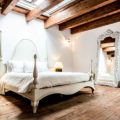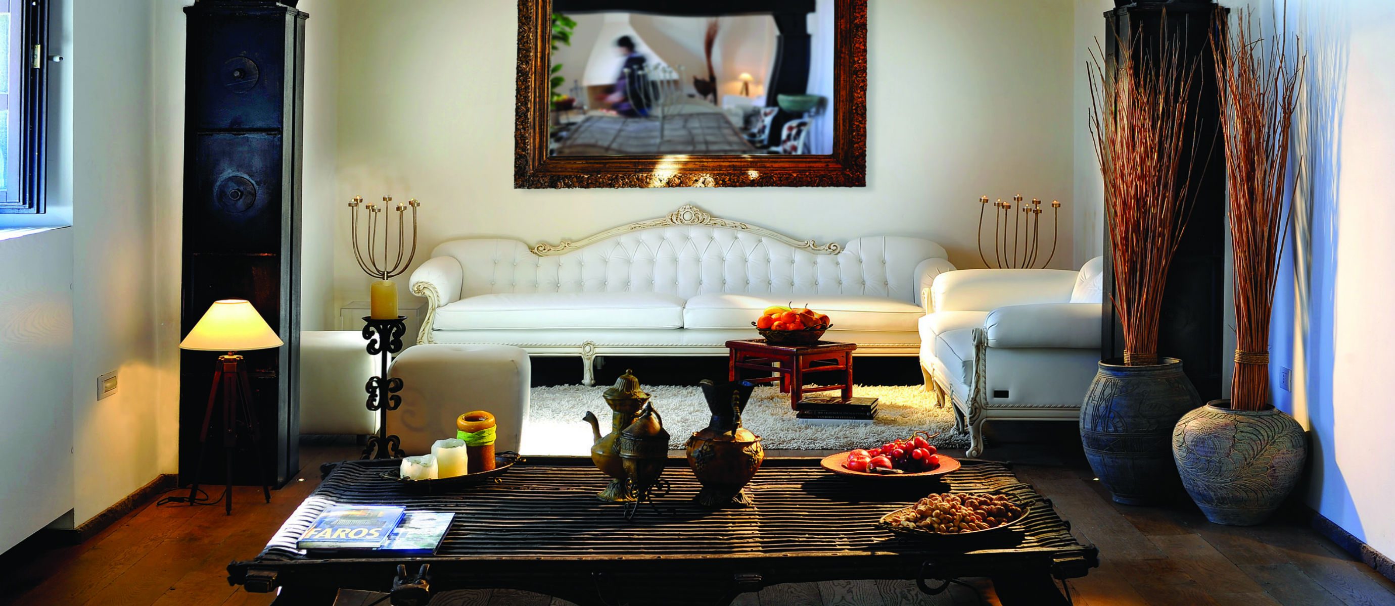 In this magical atmosphere , breakfast around the pool is enjoyed at tables created from old Turkish carts; a majestic Indian trunk is the perfect place to keep books in the tearoom; in the bathrooms on the ground floor the basins are set into an old Mongolian mortar and the frame of a mirror conceals 42 Indian stamps, used to print textiles. These unique manufactures live side by side with designer objects, such as the Murano red crystal lamps and Louis XIV white leather sofas that are found in the lounge.