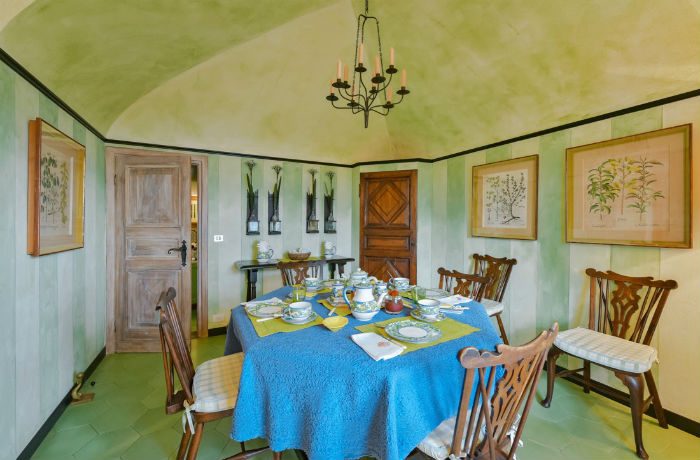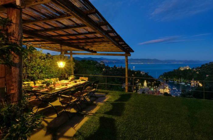 As befits a property of this stature, the interiors have been exquisitely appointed with great furnishings throughout. Occupying the first floor is the spacious master bedroom, dining room and sitting room. The sitting room is decorated in a serene blue. This leads to the terrace introduced by French doors. The remaining four bedrooms are on the ground floor, opening directly into the garden. Moving on to the garden, there are four different outdoor dining areas, one of which features a beautiful vine-covered gazebo on a plateau. Guests will undoubtedly use this plateau as a choice vantage point from which to marvel at the Sea of Portofino. There is also a bar carved out from the rock of its natural surroundings. The beautiful areas of lawn and gardens are filled with flowers and trees.