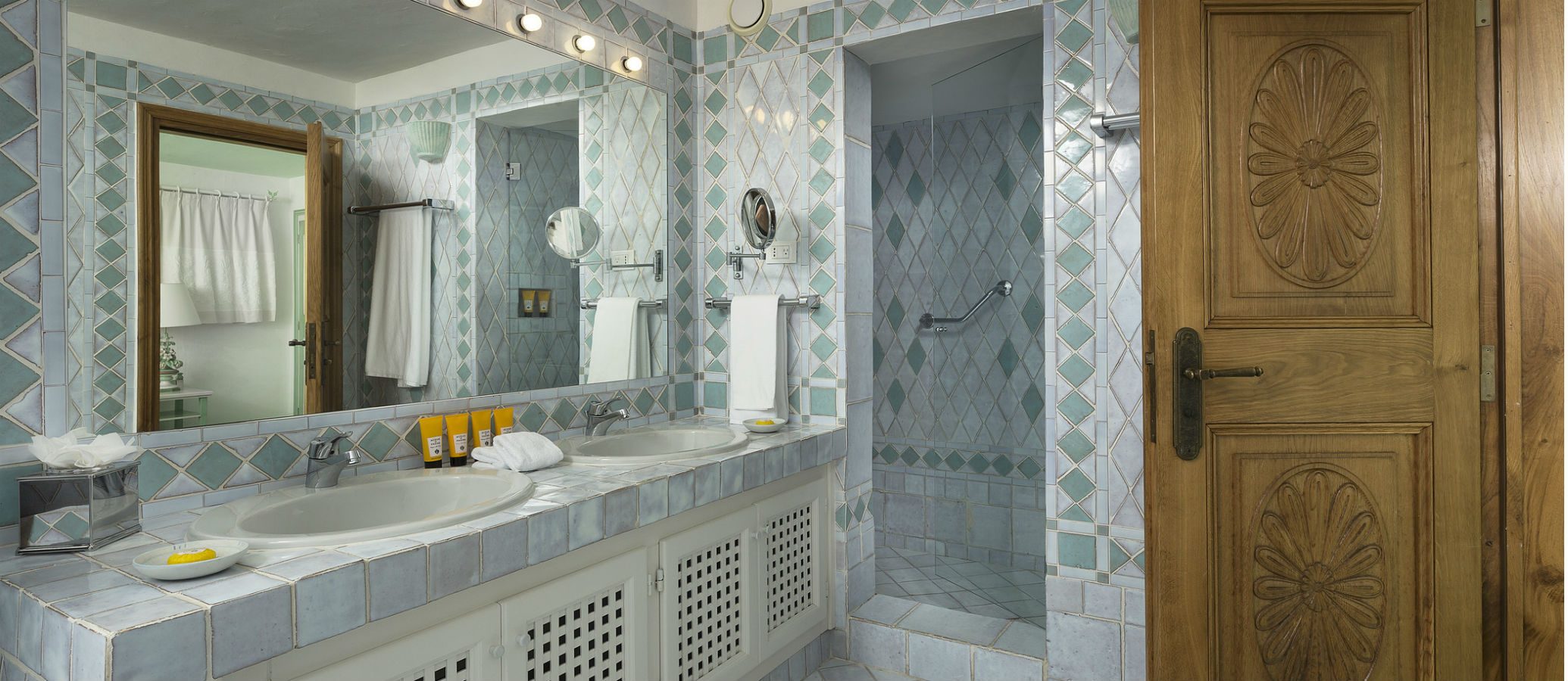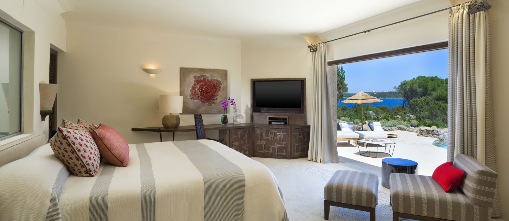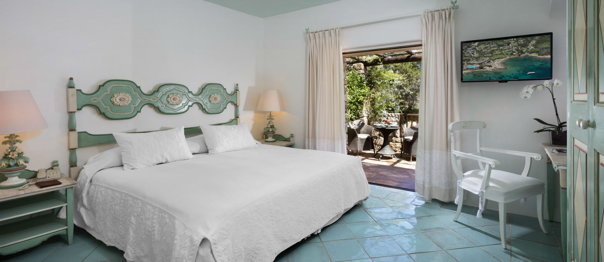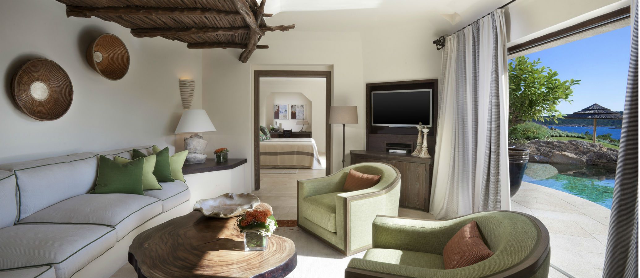 All 44 rooms, 5 suites, 9 unique suites with private pool and 6 villas offer fabulous views of a magical landscape, and inside, the alluring beauty of handcrafted Sardinian furniture, natural stonework and marble perfectly complement the latest hi-tech amenities – satellite TV, DVD/CD player, WiFi Internet, air-conditioning and duplex telephone line.