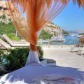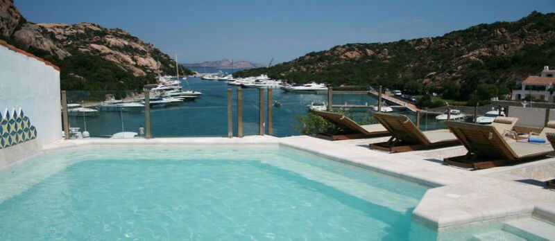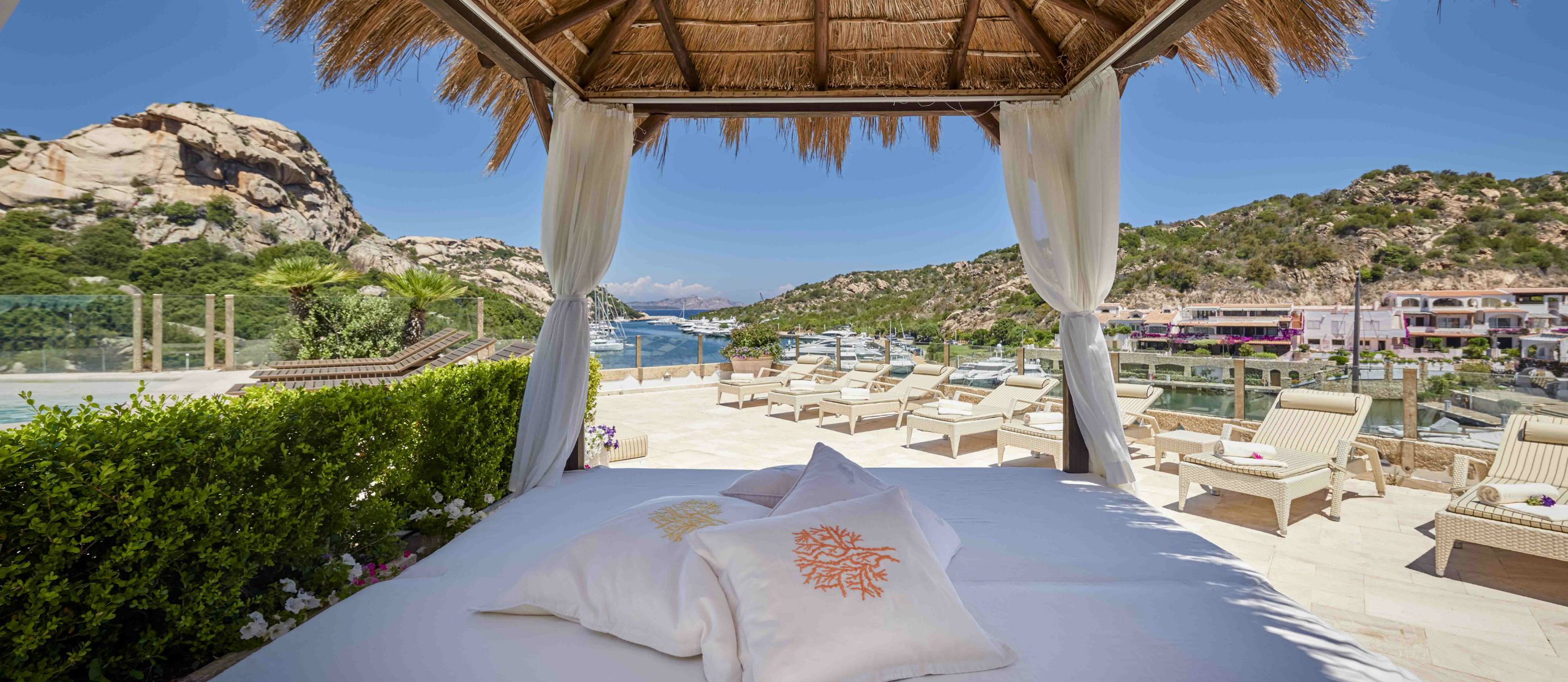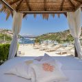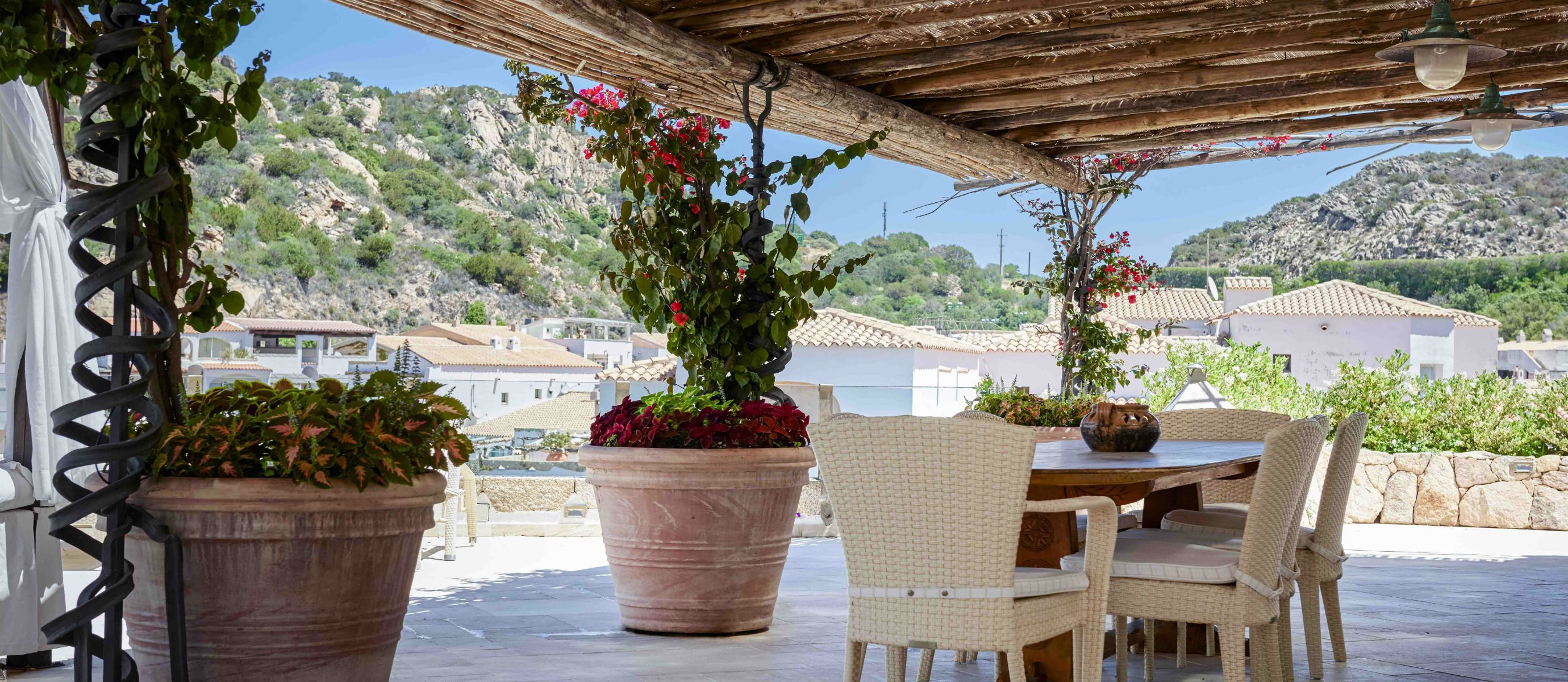 The living area gives direct access to the 250 m2 terrace with sea view with private 8x5m swimming pool made from Sardinian granite and equipped with hydro-massage along with a lounger, a gazebo decorated with lightweight curtains and a large table for 8 people, ideal for al fresco summer lunches with a sea view. The absolute privacy of guests of the Presidential Suite is guaranteed by an additional external entrance which, from the village square, leads directly to the main entrance of the Suite.