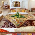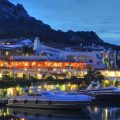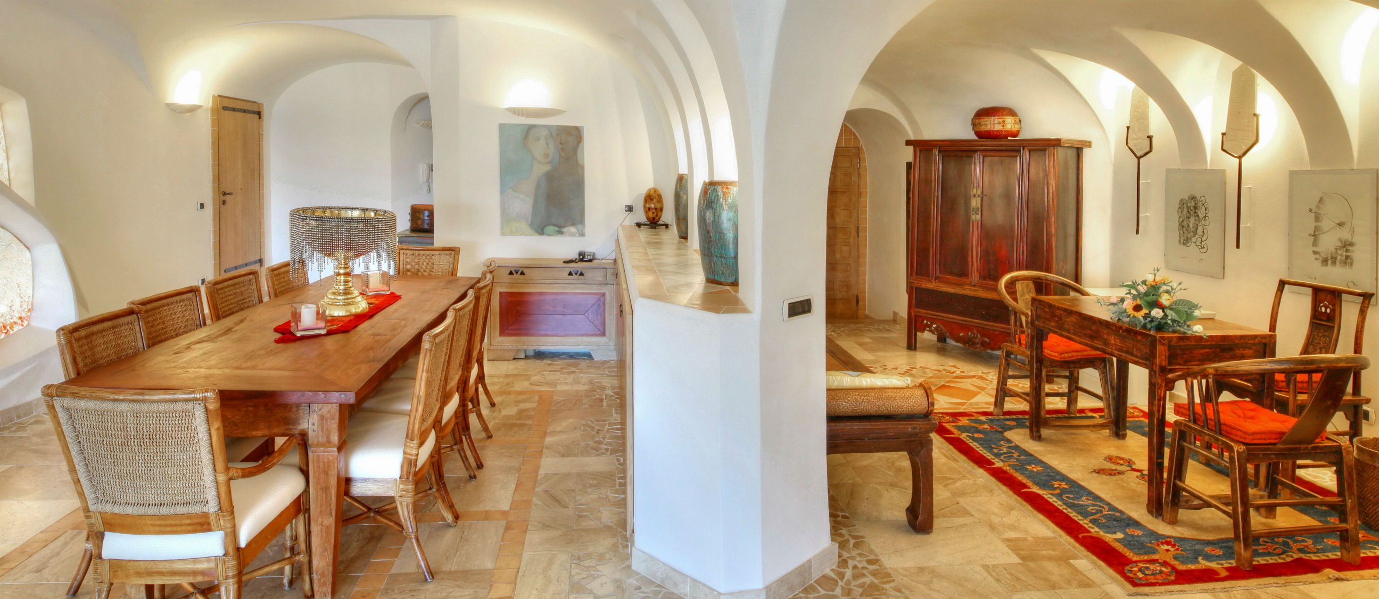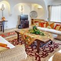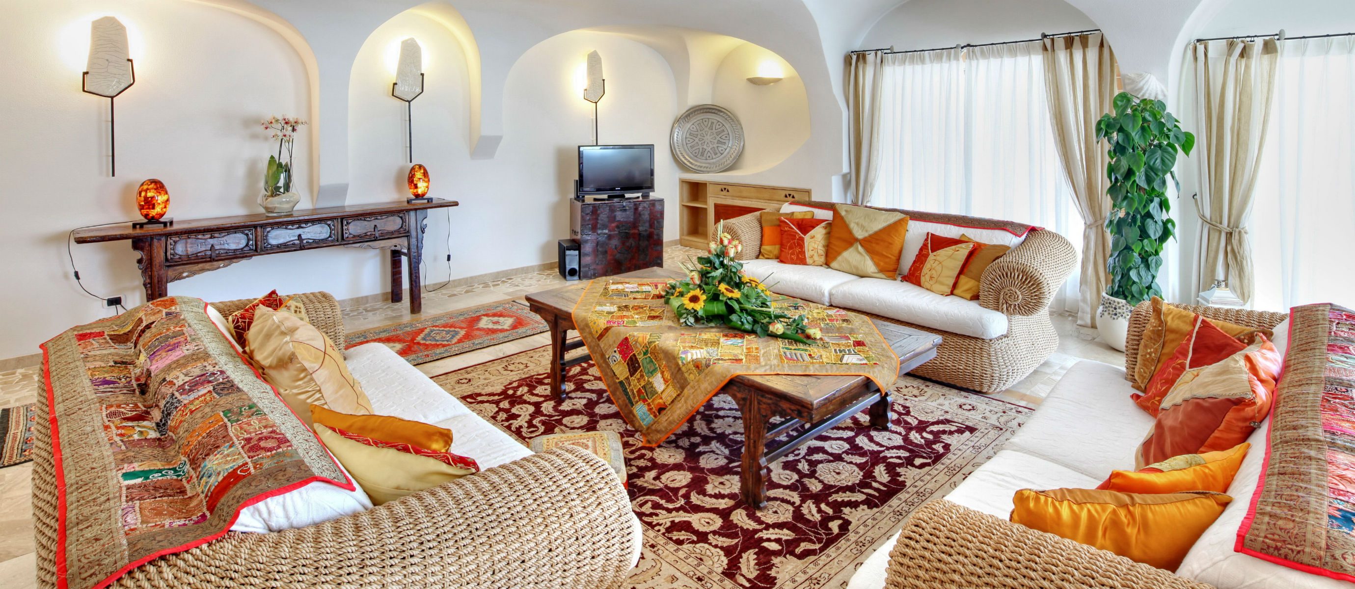 The bathroom in the main bedroom of the Presidential Suite is equipped with a Jacuzzi bath. The living area, of approximately 180 square metres, has marble flooring and is illuminated by large windows that open onto the private terrace overlooking the natural fjord of Poltu Quatu. The light colours of the two large sofas with cushions contrast gently with the warm colours of the carpets and oriental decorations. The walls are embellished by unique works of art and refined oriental antiques.