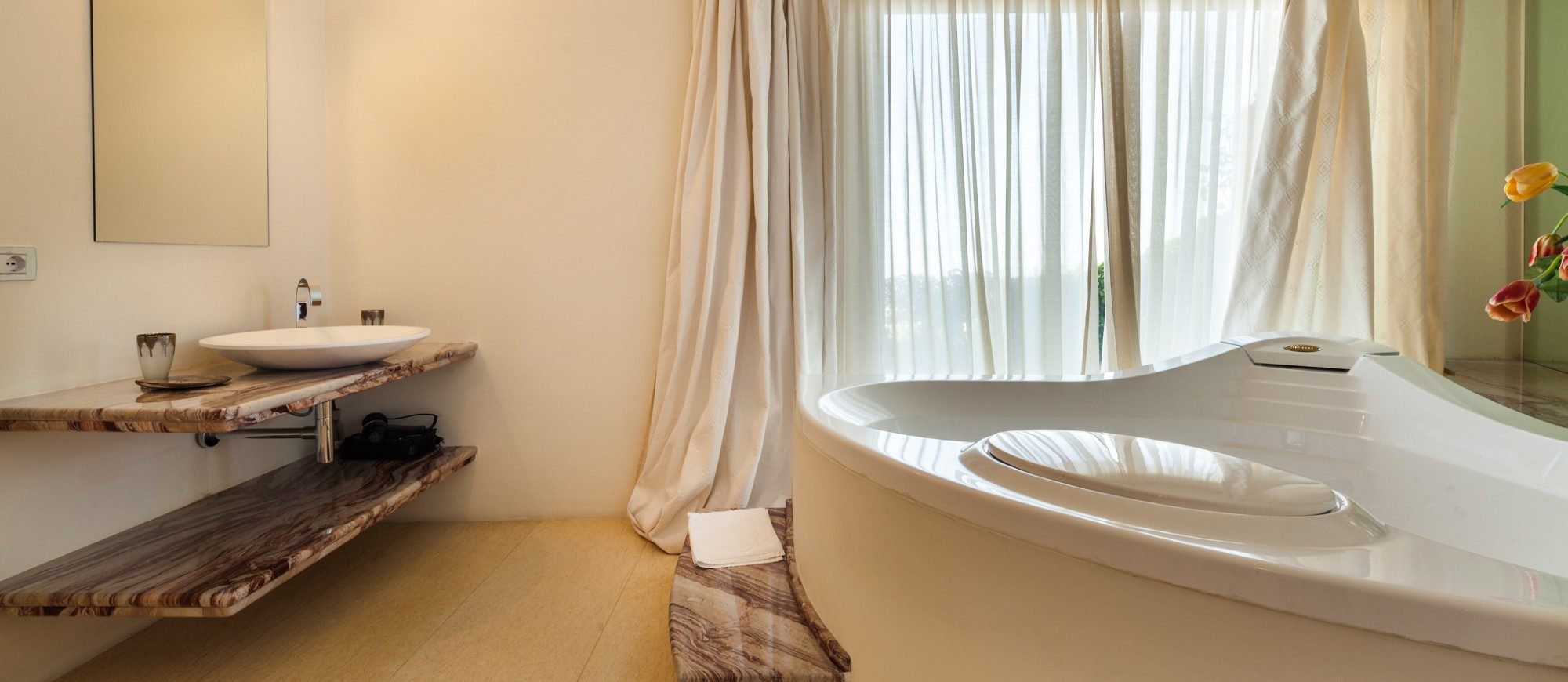 Built into the rocks, this is a very spacious property with loads of light in all the rooms. There are many separate seating areas both inside and out. There is a special terrace between the houses, with dining table and summer kitchen.