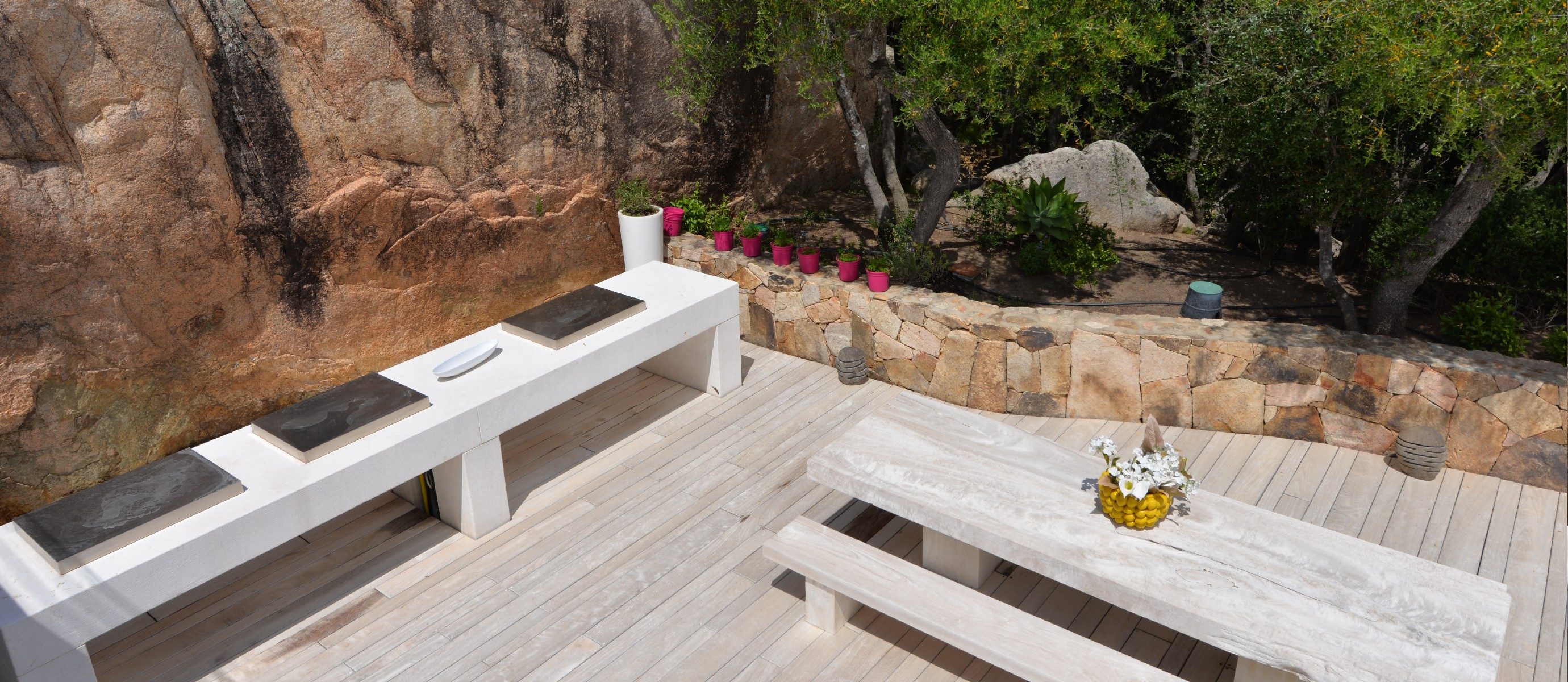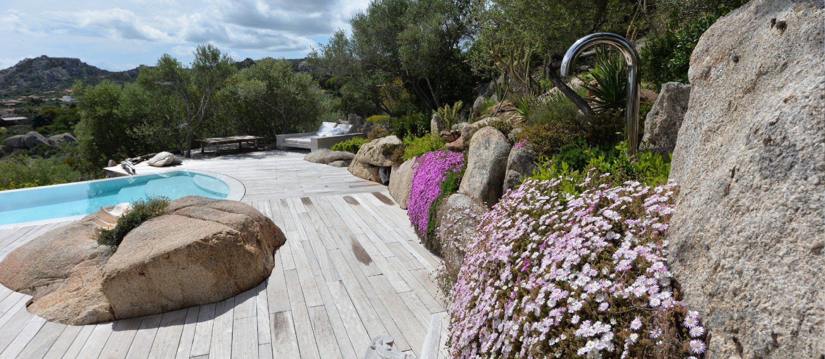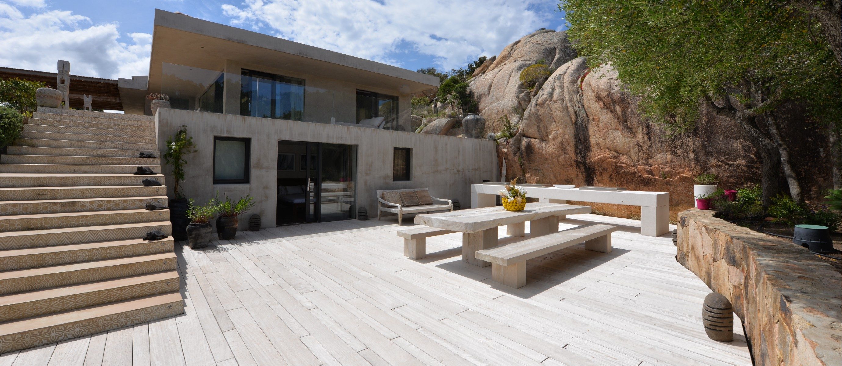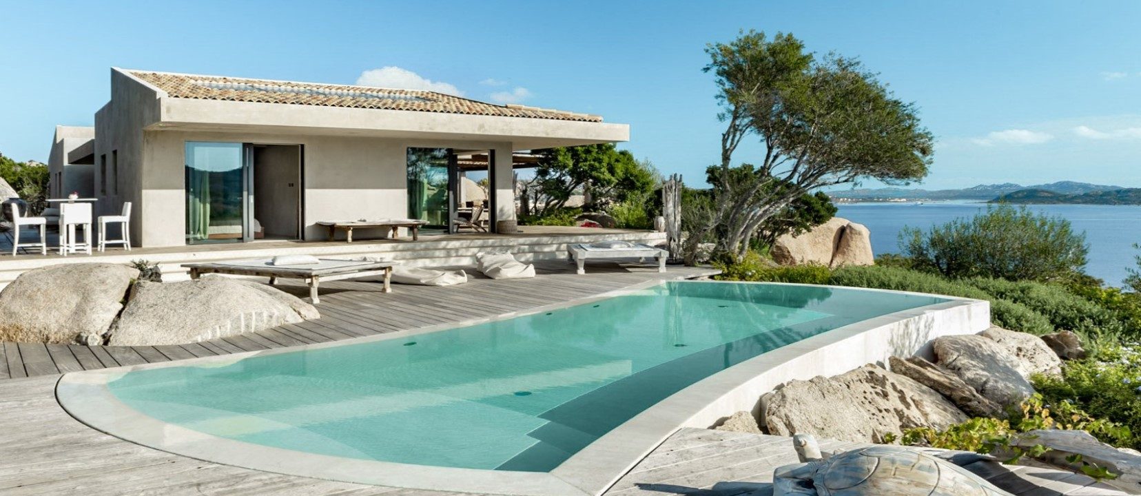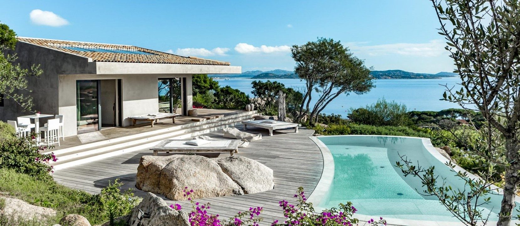 This is a charming modern villa nestling into the granite rocks above Porto Rafael. There is an infinity pool with sundecks and sunbeds, with stunning views of the islands. There are several outdoor areas for relaxing and al fresco eating. The piazza, the shops, the bars, restaurants and harbour are all within walking distance. It is a short walk or drive to several different beaches.