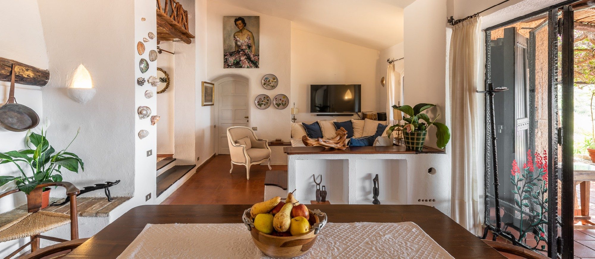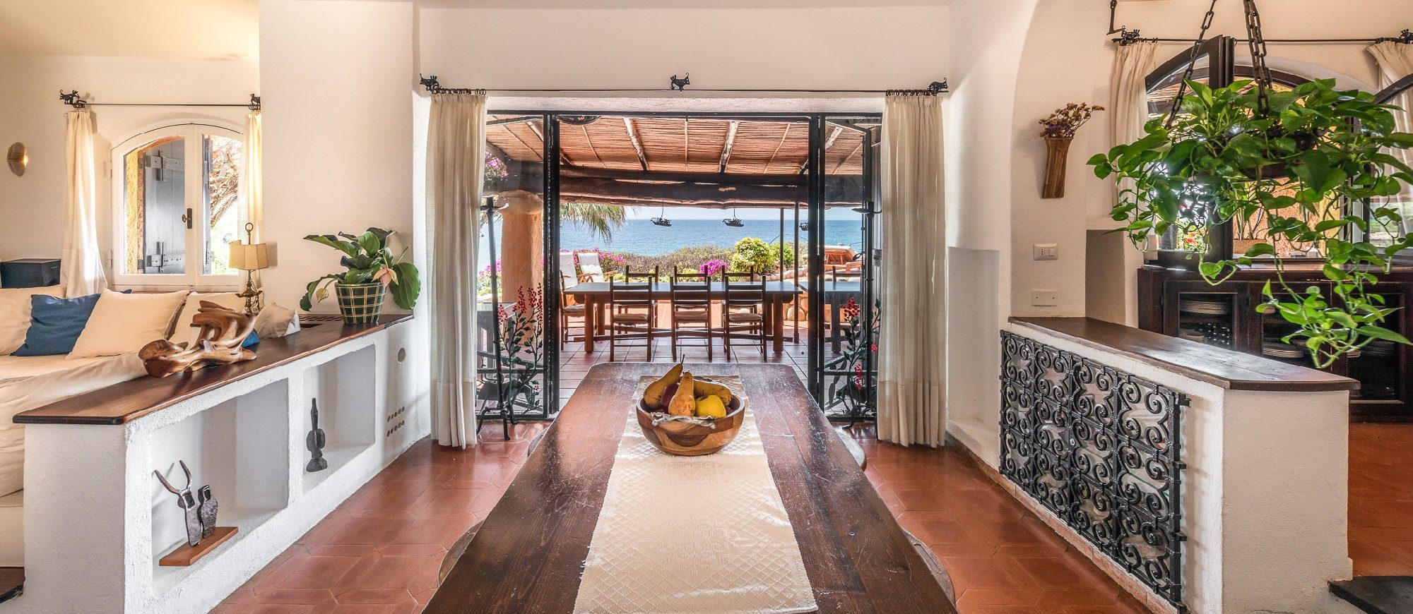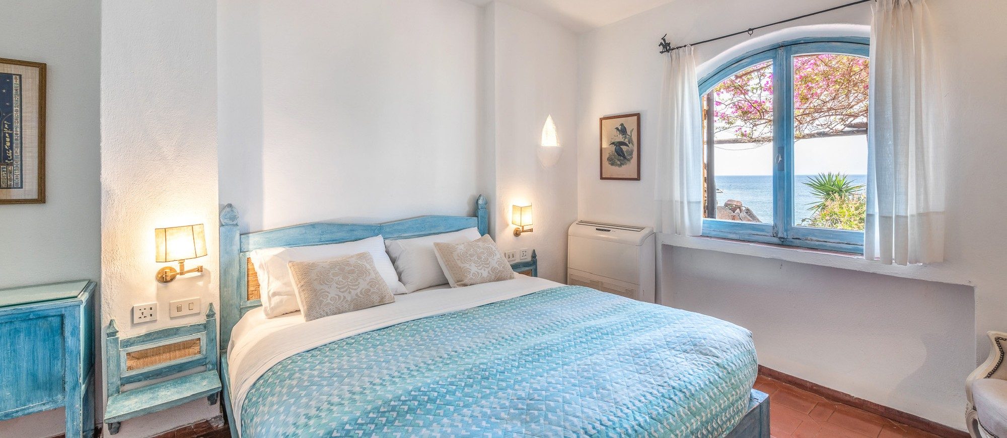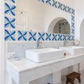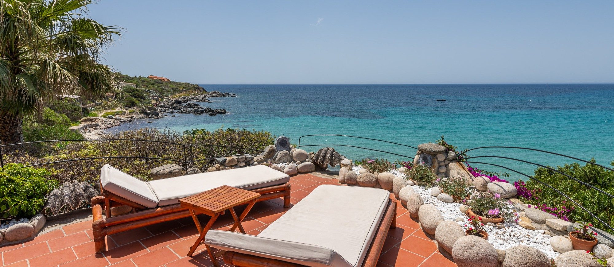 This idyllic Sardinian escape is renowned for those in the know, the beautiful little village where the villa is located comes to life in the summer, conveniently situated halfway between the capital city of Cagliari and the picturesque town of Villasimius. The villa design, approached with research in the historical context, results in an eclectic sea-home style with wooden pieces and terracotta floors, with unique touches of stone lending a rustic feel to the interiors. Elements of classic Italian residential architecture, such as the handmade tiles in Sardinian style and the terracotta floors, are combined with contemporary touches, like white concrete walls, modern tiles and decor.