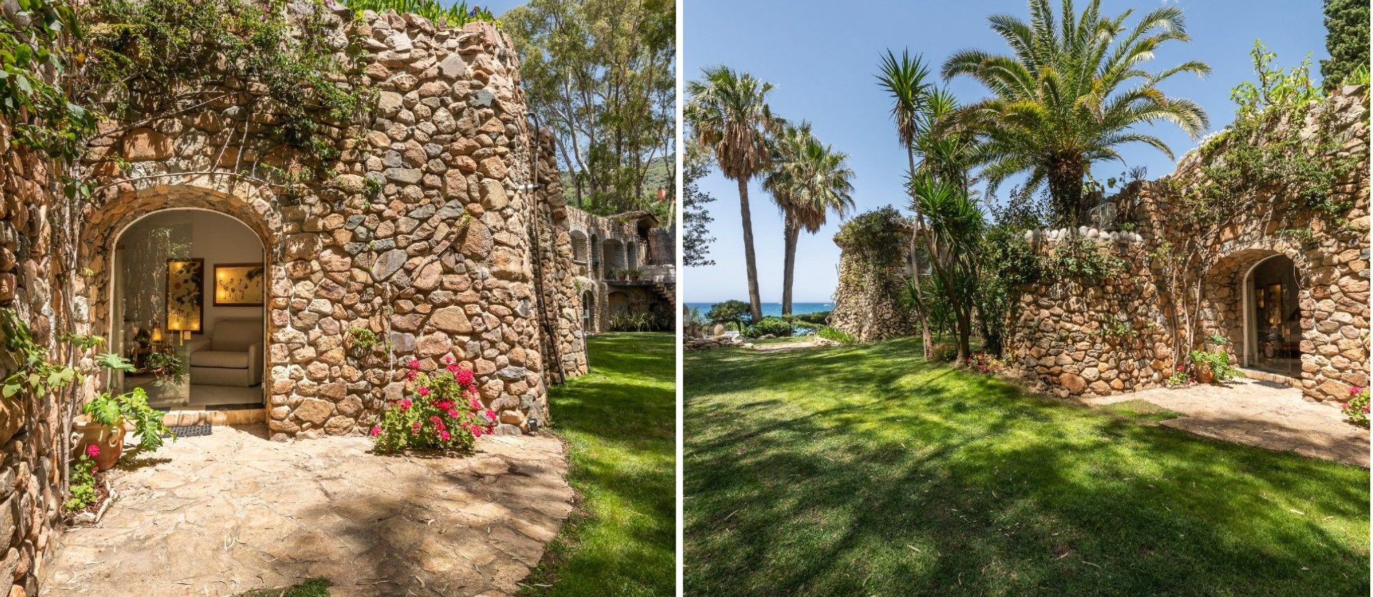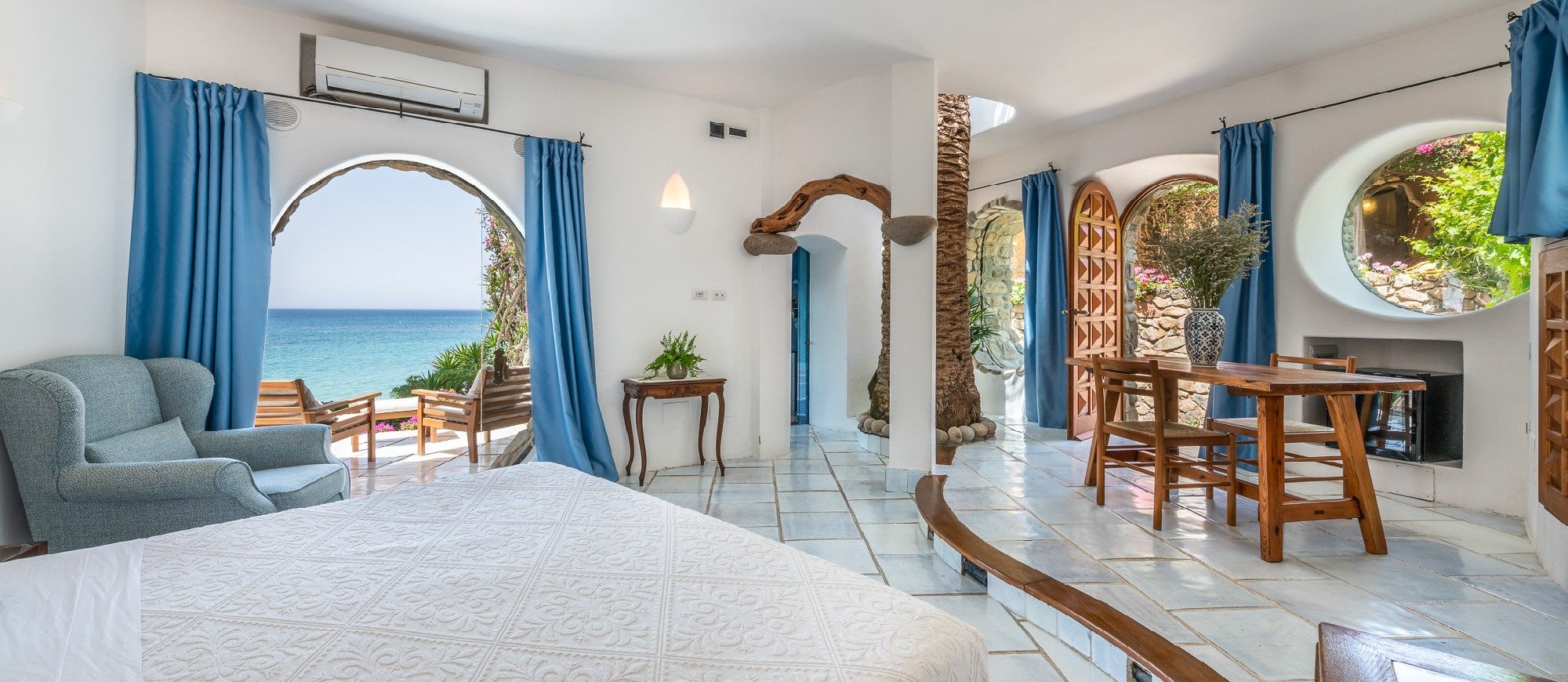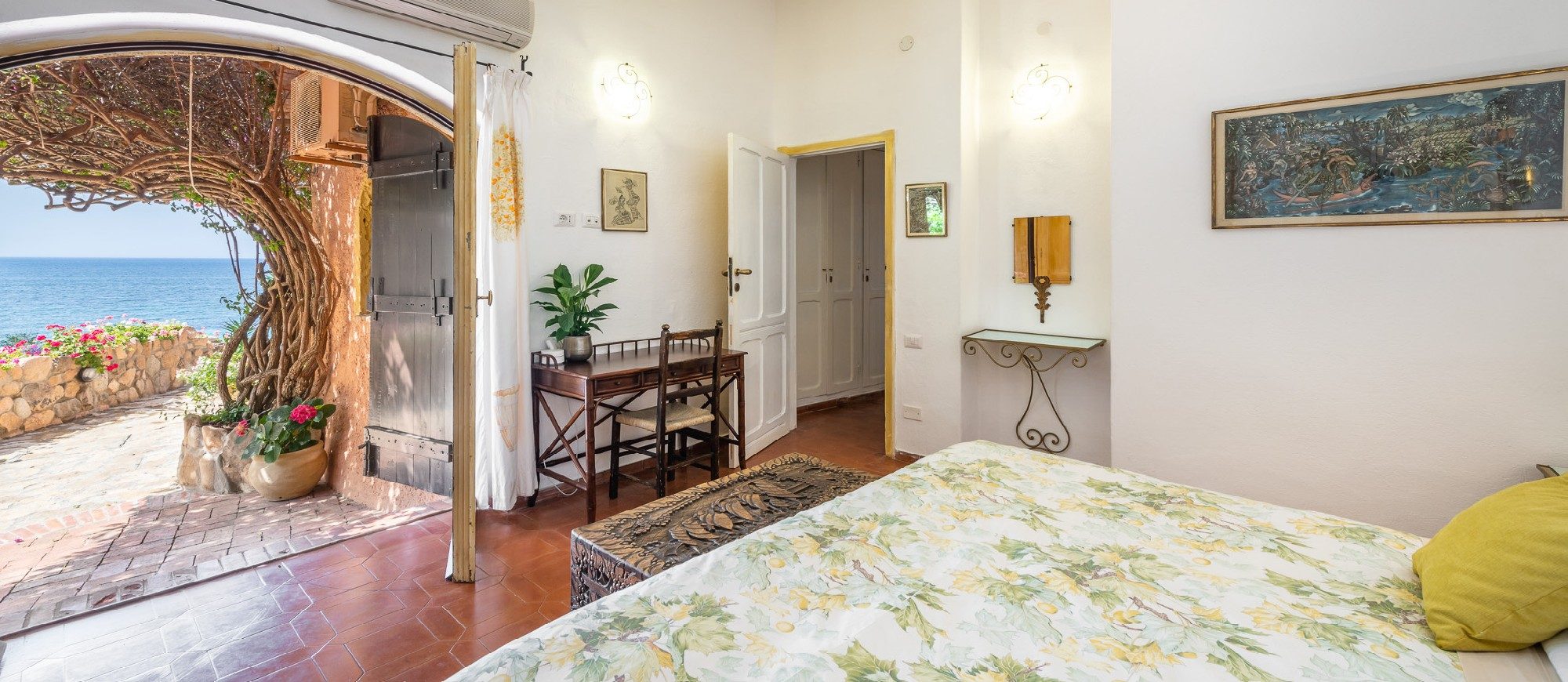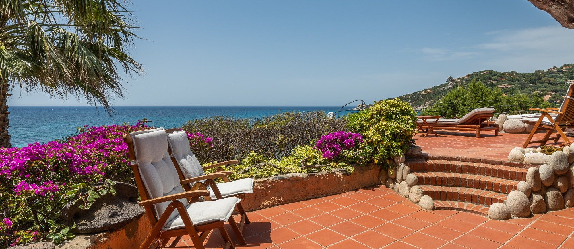 Materials include handmade ceramic, marble and granite stone locally sourced. Modern and very comfortable, this bohemian-chic retreat is full of light with a solid sea-life vibe, blending traditional and contemporary Italian architecture. The house is built in stucco, wood, cotto with extensive use of local stones; it has a terrace with sitting area, stone tables, patios all with a sea view and an alfresco area for 20 guests. The external area measures 2.000 m2, with a Mediterranean’s style garden and a breath-taking front-sea view, several terraces and garden areas to enjoy the outdoors.
