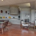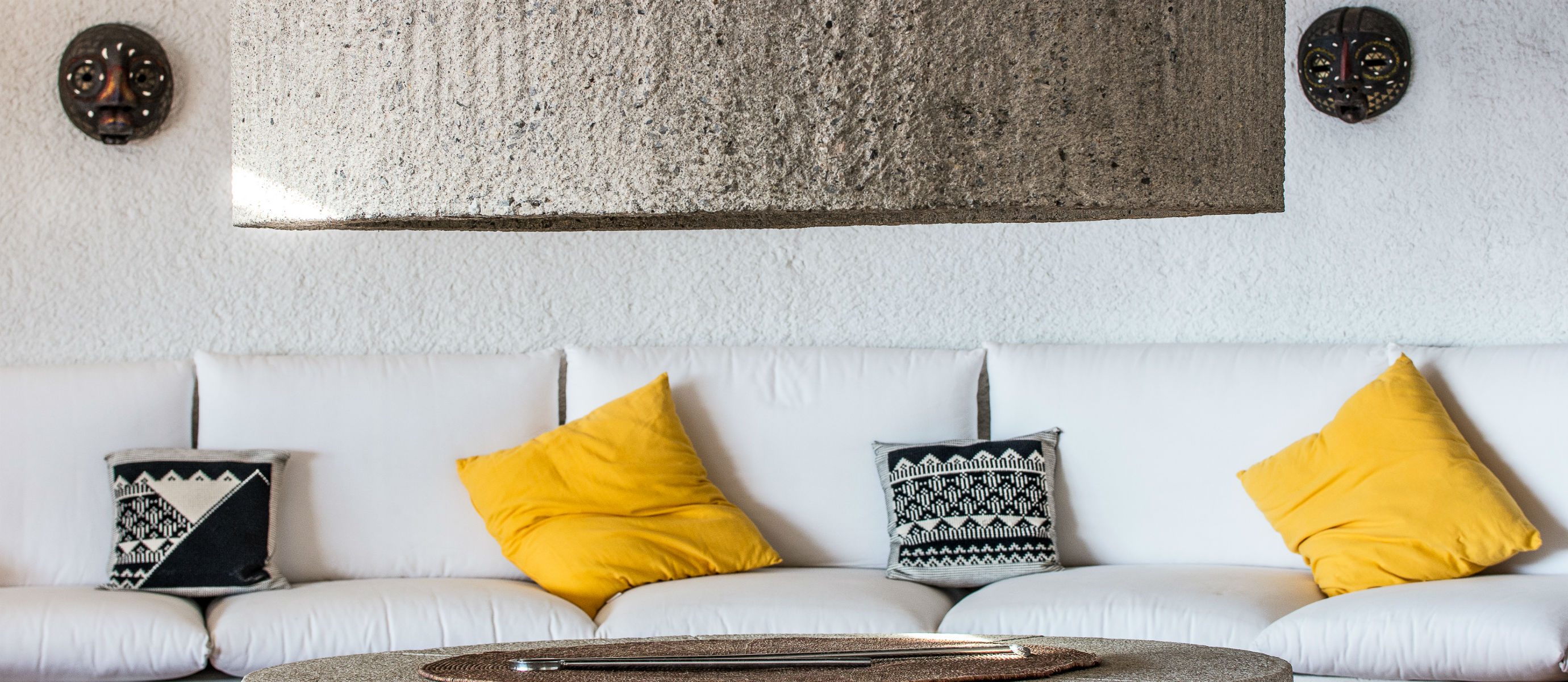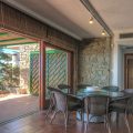In the main villa, there is a large sitting room with feature hanging fireplace, opening onto a terrace on the water. This is the reception room, with a dining area, convivial social zone on a raised lounge around the fireplace, and large French windows that open onto the sea view terrace.
