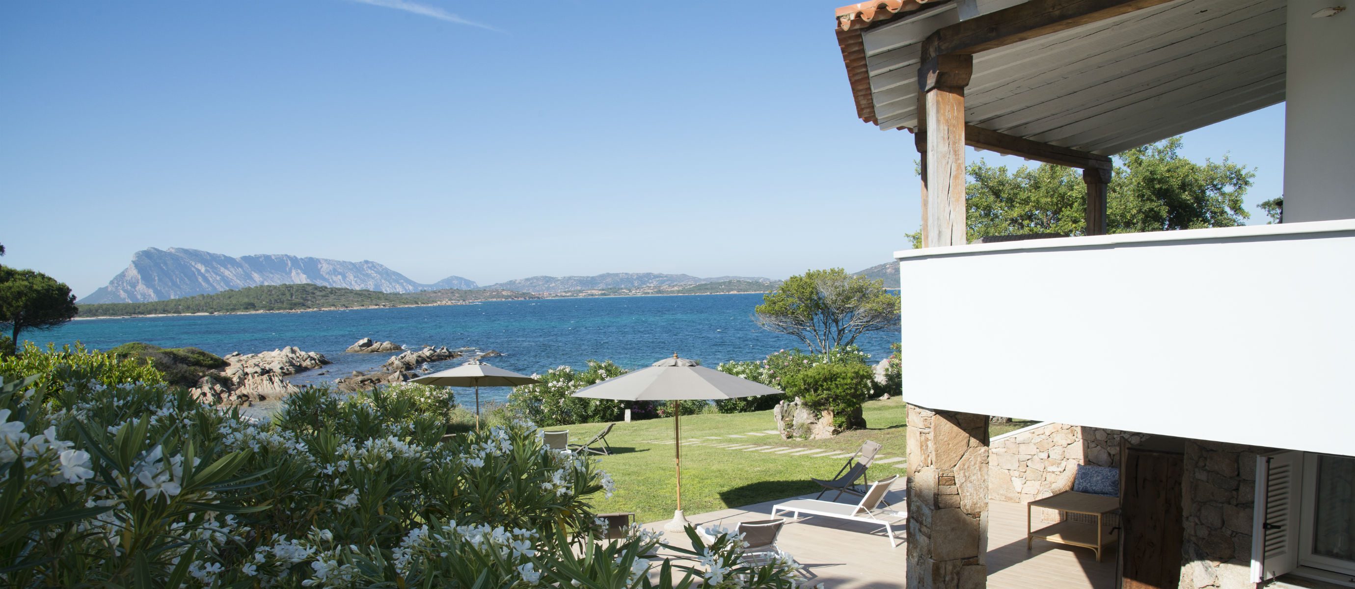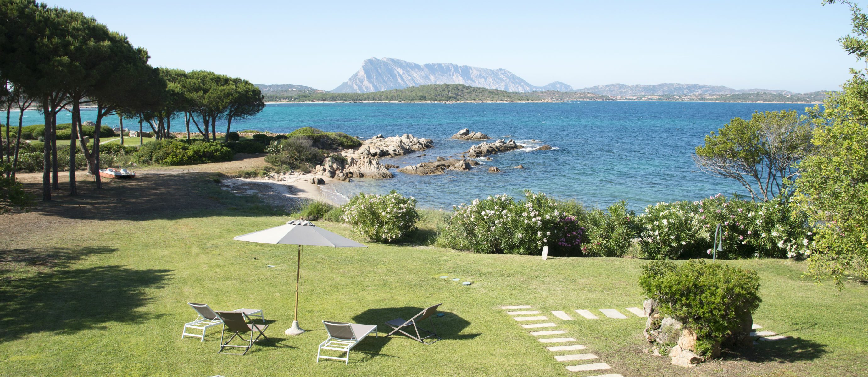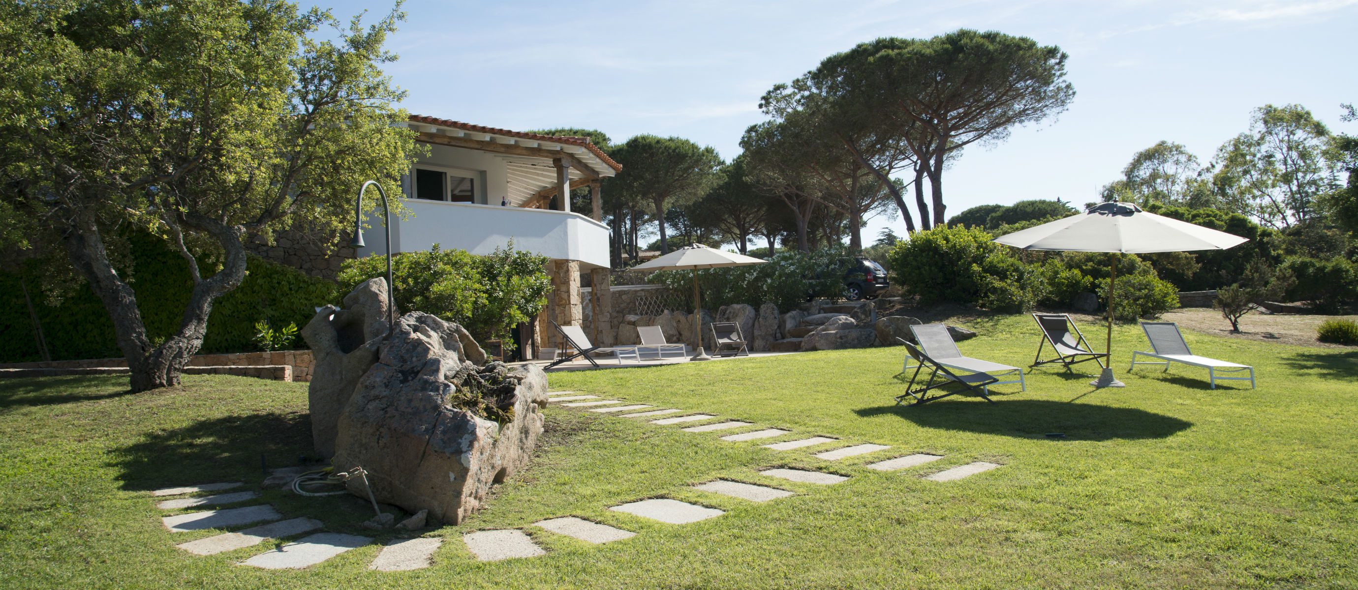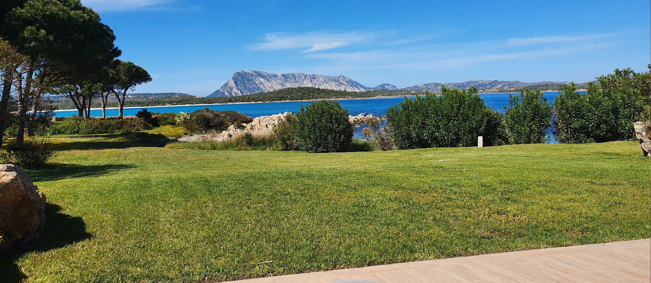 A spacious terrace has sofas and chairs, and also a table for outdoor dining. There is a large garden and maritime pine forest, with olive trees and cacti, and an outdoor shower. There is a BBQ on the terrace. You can hear the sea from the villa at night and watch the changing colour of blue during the day, with the island of Tavolara in the distance.